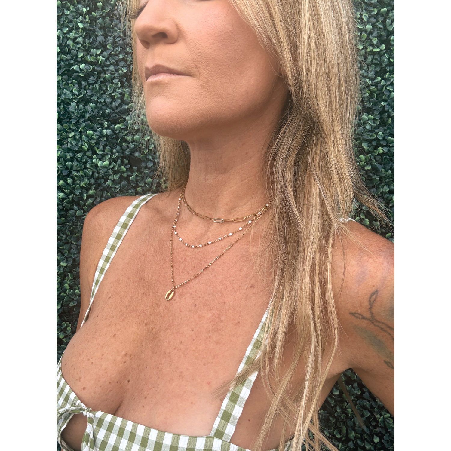 - Includes: Paperclip Choker (14"), White Chain (16"), Cowrie Pendant (18")