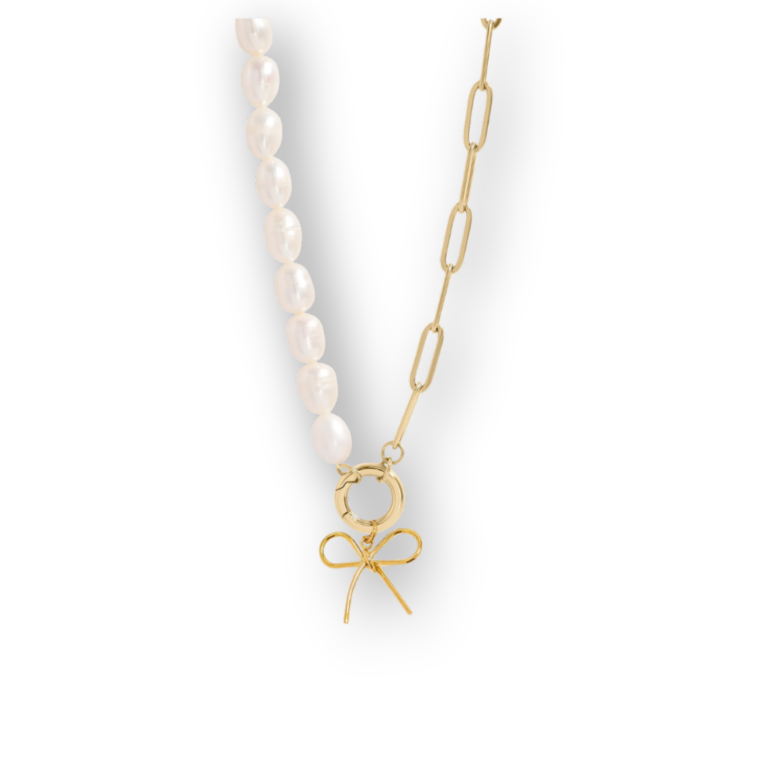 Made from durable stainless steel and coated in 18K gold PVD, this piece is built to shine. A luminous freshwater pearl adds a hint of natural elegance, with a stainless steel bow charm.