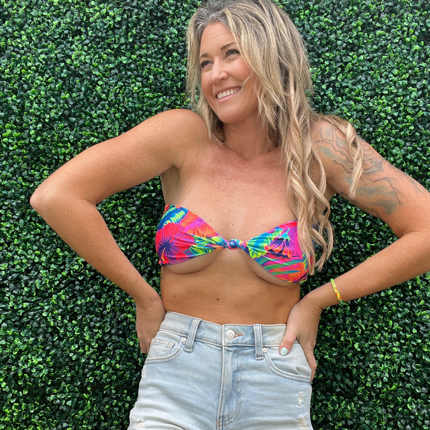 Our Sand Bar Top is a strapless bandeau with a playful front knot, making it a must-have for any beach getaway. Its flattering fit keeps things ultra sexy while staying comfortable and stylish. Crafted from high-quality, quick-drying, fade-resistant fabric, it retains its vibrant color and perfect shape wear after wear. Effortlessly flirty and practical, this top is your go-to for sun-soaked days.